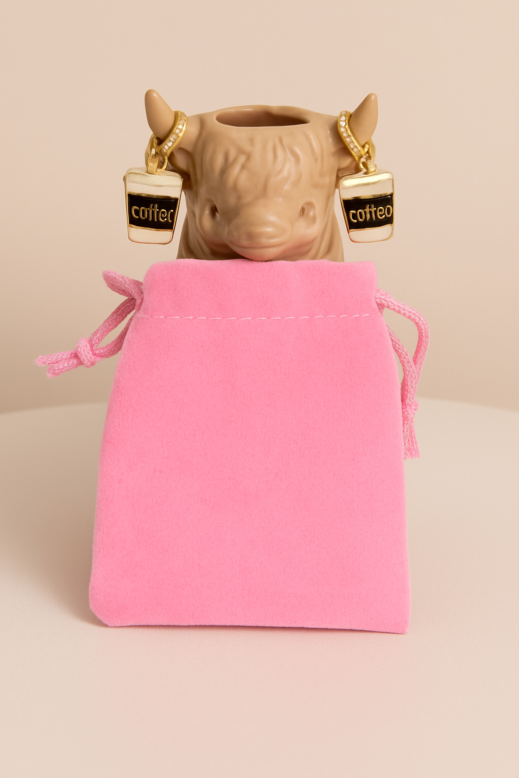Adorable gold coffee cup earrings perfect for coffee lovers. Lightweight hoop design with rhinestone details. Includes jewellery pouch. Shop SMGemz now!
